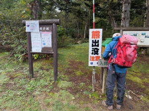 雨竜沼登山口 8:25 9月24日 宿を6時に出て移動。毎度のことながら、ここにもヒグマ看板。途中の車道にも大きな糞が。こんなに痕跡はあるのに、一度も姿を見かけたことが無い。これはこれでラッキー? |