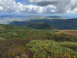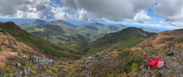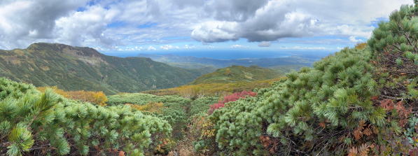 暑寒別岳頂上 10:58 頂上からの景色は最高。海から近いこの地域にこんなにも素晴らしい深山が。ガイド様曰く、冬は大変ですよ~・・。 |
