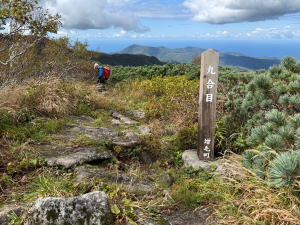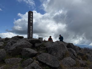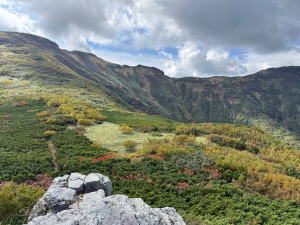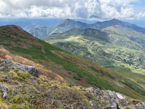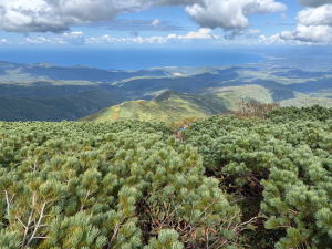 暑寒別岳頂上 10:58 頂上からの景色は最高。海から近いこの地域にこんなにも素晴らしい深山が。ガイド様曰く、冬は大変ですよ~・・。 |