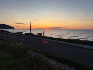 昨日に引き続き、宿泊先前から望む夕陽。 最果て感が良いわ。 |