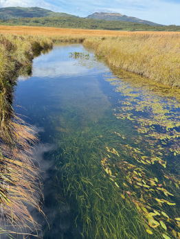 草紅葉の湿原は、吸血系の虫もおらず、 逝きそびれたヤンマや南への旅立ち準備に忙しい小鳥がちらほら。 強い風もココでは絵を盛り立てる役者の一人です。 |