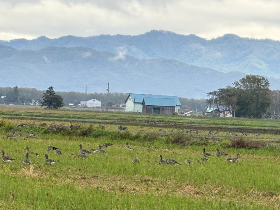 翌日は朝が荒天、昼から雄冬で荒天の海を見る相談をしていたら、 何の拍子か私がガンの渡りをいつか見たいと口にしたところ、 ガイドさん曰く、”そう言えばこの近くにガンの渡りの中継地がありますよ。渡りの季節はっと、アレ、今真っ盛り!” 行かない手はありません。 美唄の宮島沼へレッツゴーっ! まずは田んぼで落穂拾いをする彼らを見つけて大興奮。 |